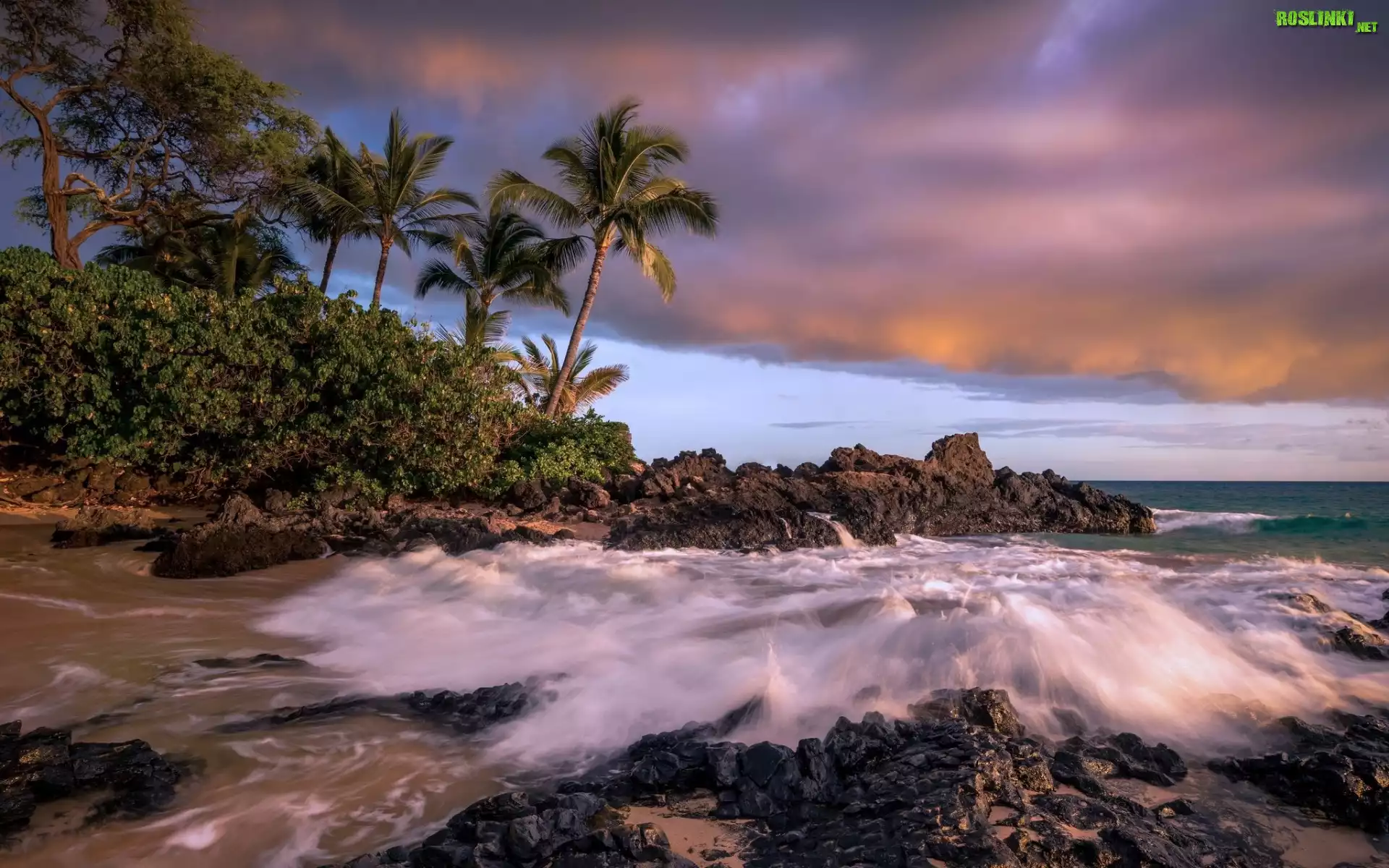 Rośliny: Plaża, Palmy, Skały, Fale, Morze, Chmury