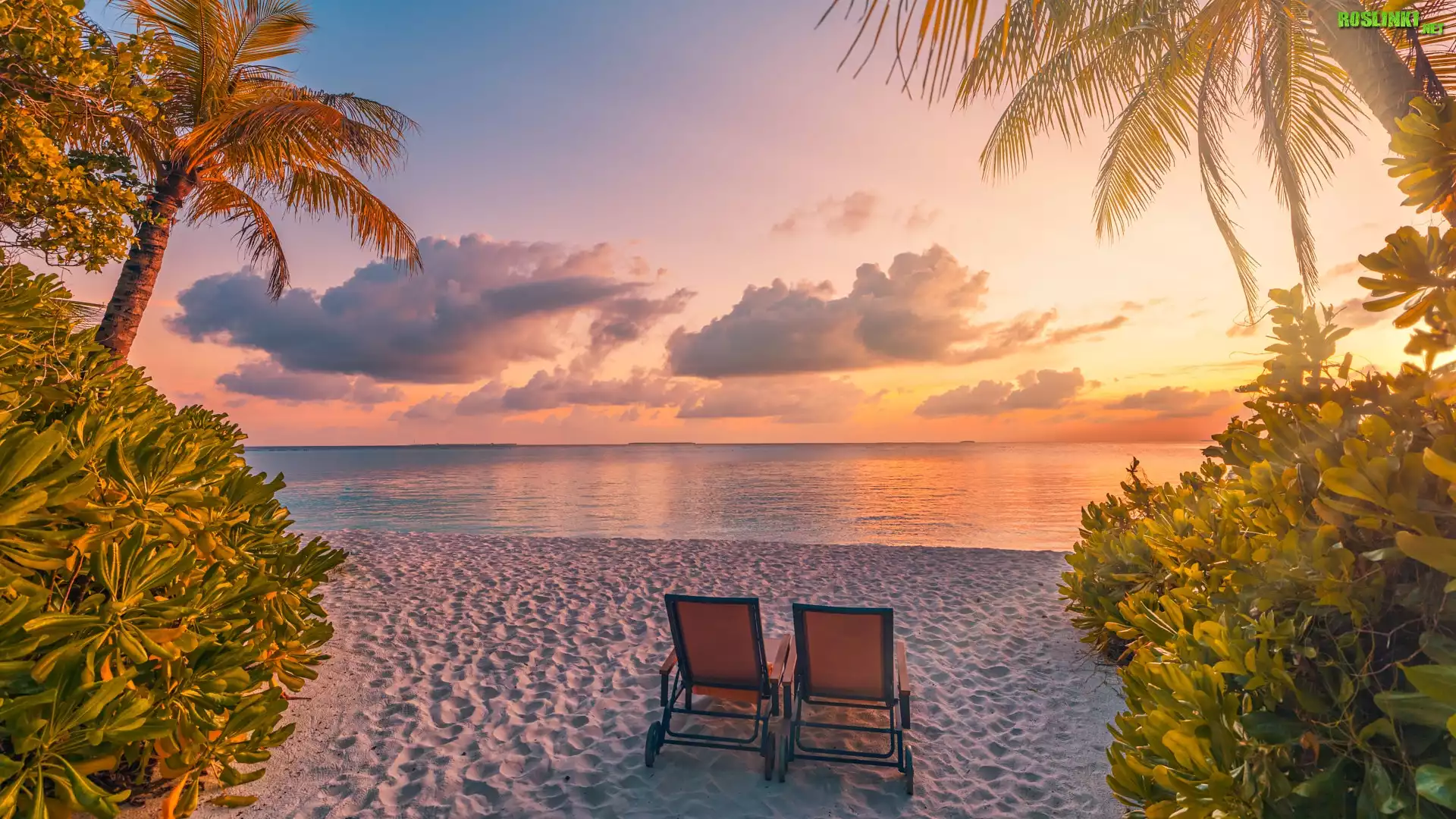 Rośliny: Morze, Plaża, Palmy, Leżaki, Chmury