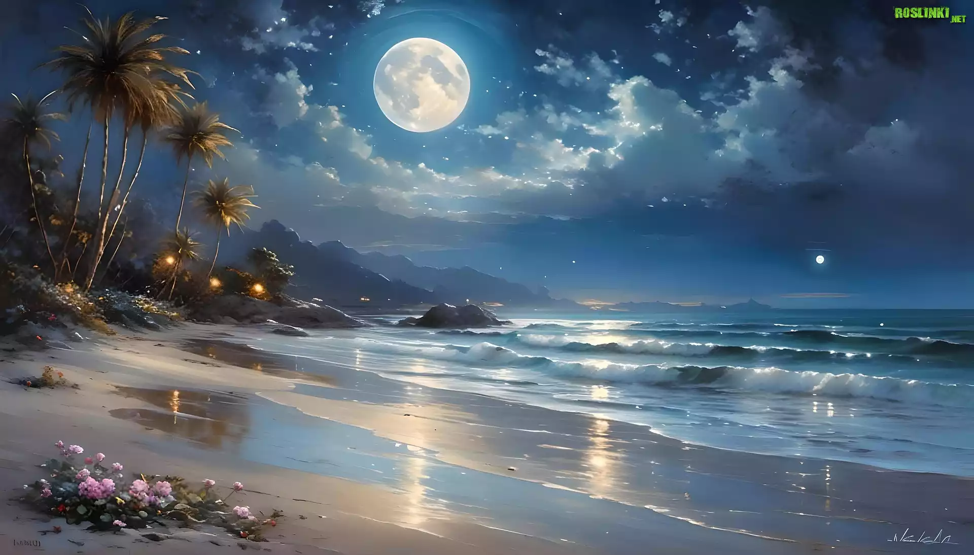 Rośliny: Morze, Plaża, Palmy, Noc, Księżyc