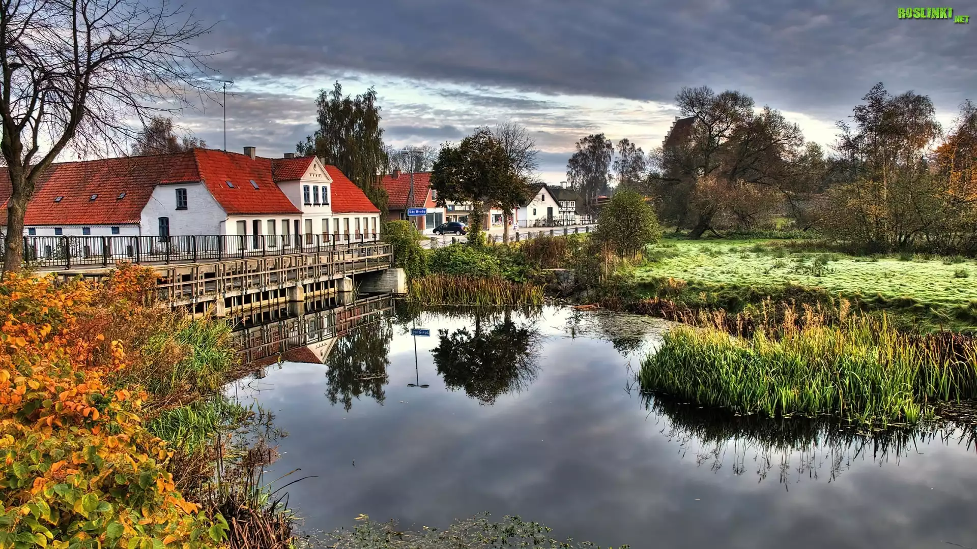 Rośliny: Pochmurne, Niebo, Domy, Most, Odbicie
