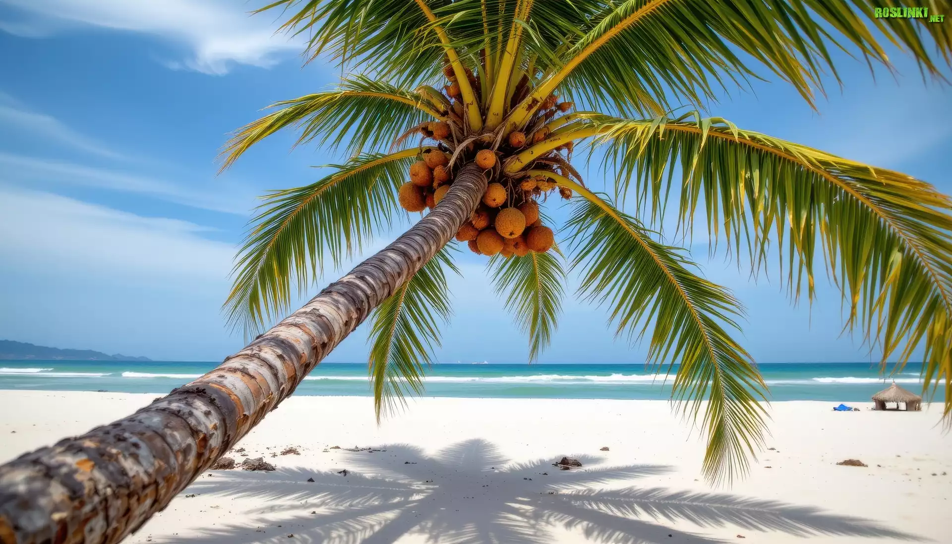 Rośliny: Morze, Plaża, Palma, Pochylona, Orzechy kokosowe, AI