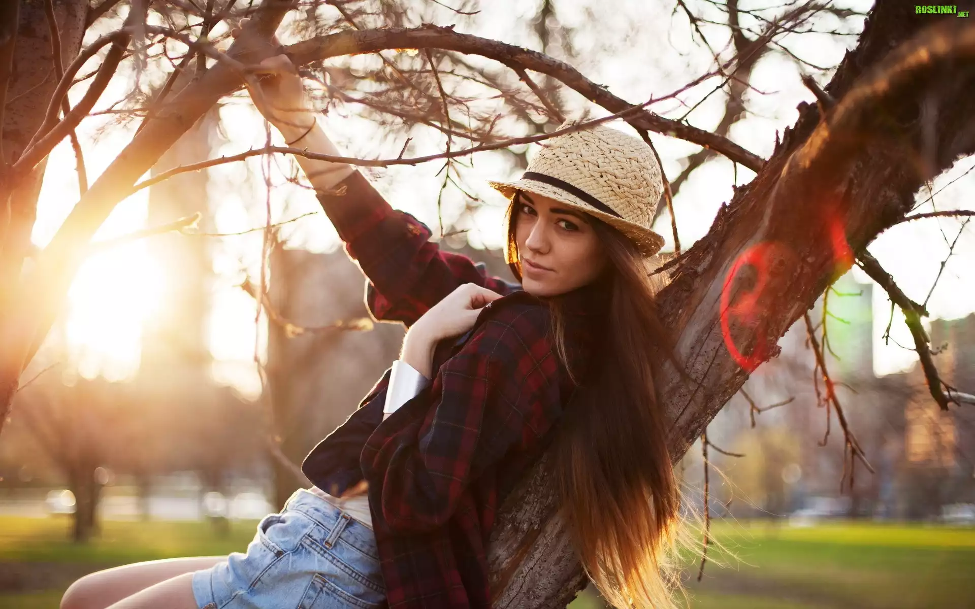 Rośliny: Pochylona, Kobieta, Kapelusz, Drzewo, Przebijające, Słońce