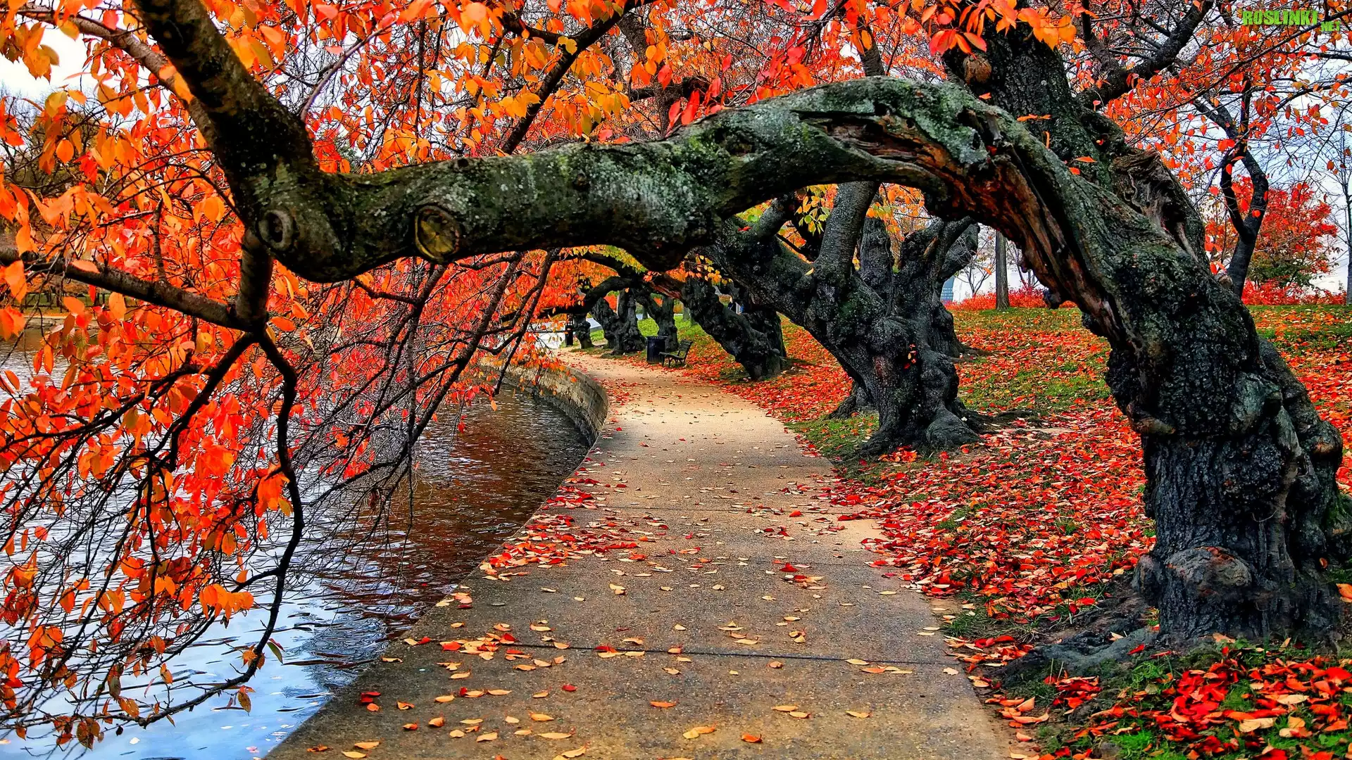 Rośliny: Jesień, Pochylone, Drzewa, Kolorowe, Liście, Park, Chodnik