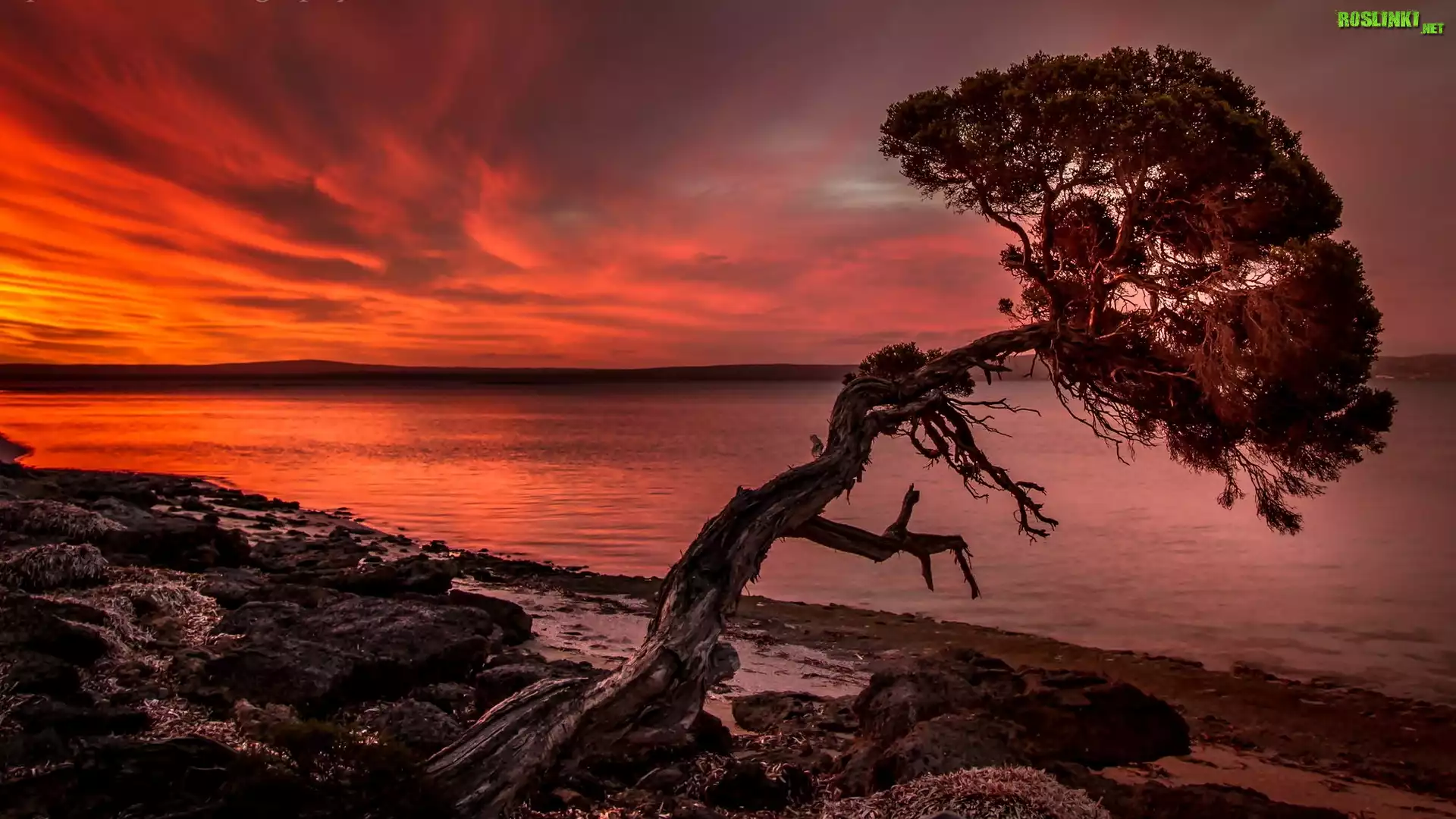 Rośliny: Pochylone, Drzewo, Morze, Brzeg, Zachód Słońca