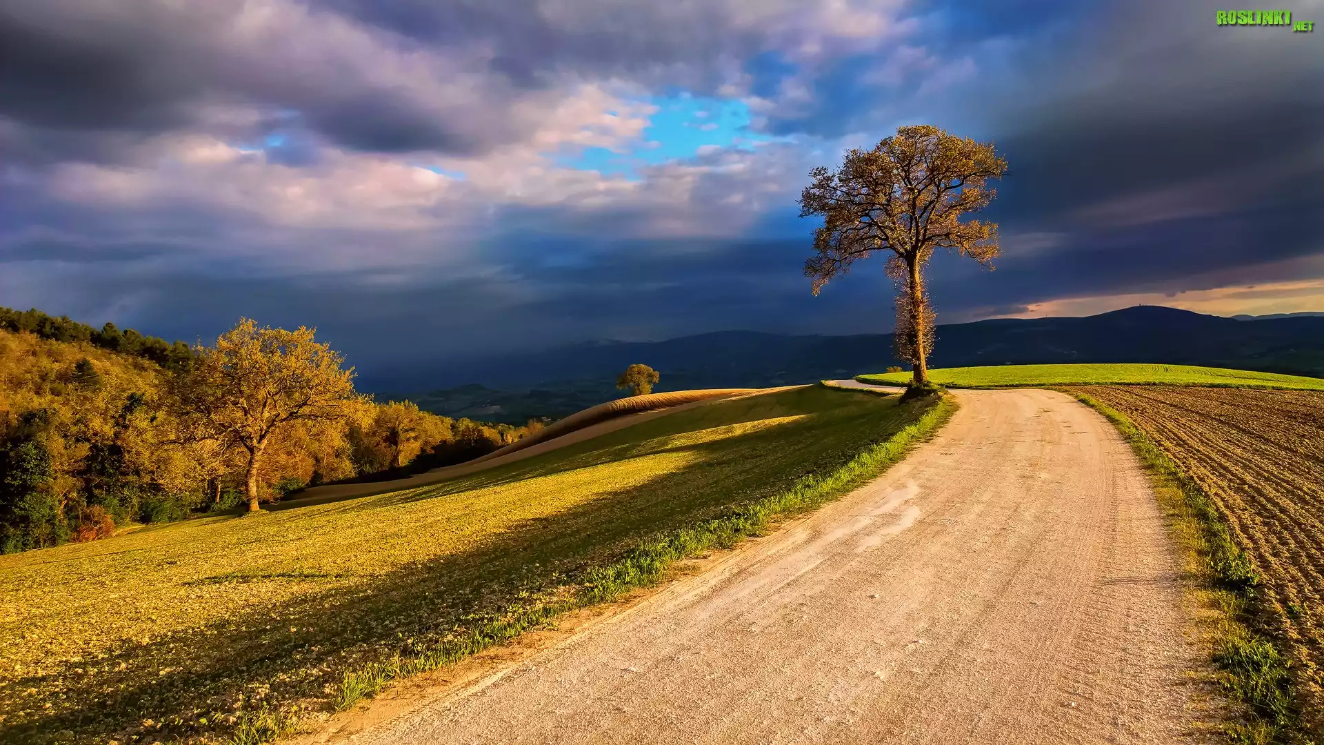 Rośliny: Pola, Droga, Zakręt, Niebo, Chmury, Drzewo