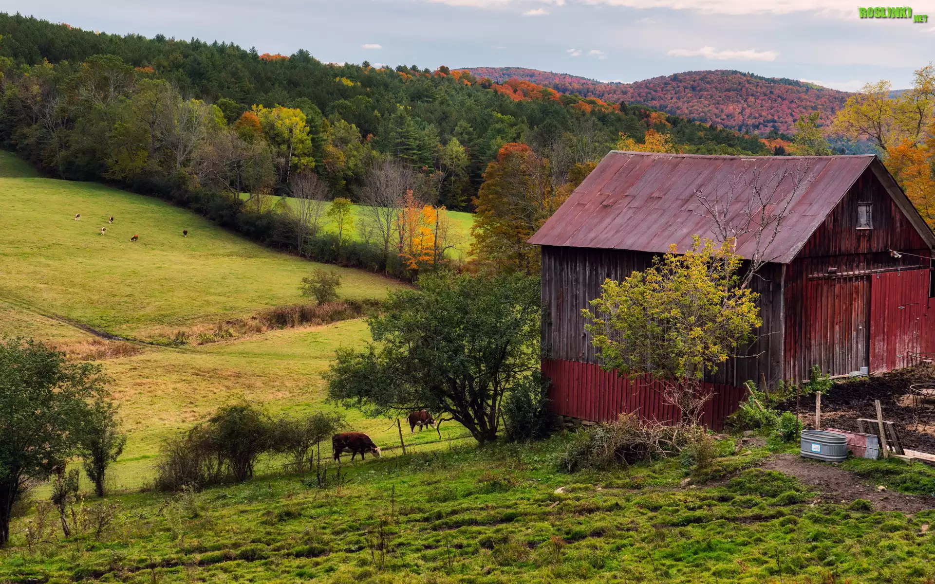 Rośliny: Jesień, Las, Dom, Drzewa, Wzgórza, Krowy, Pastwisko, Pola