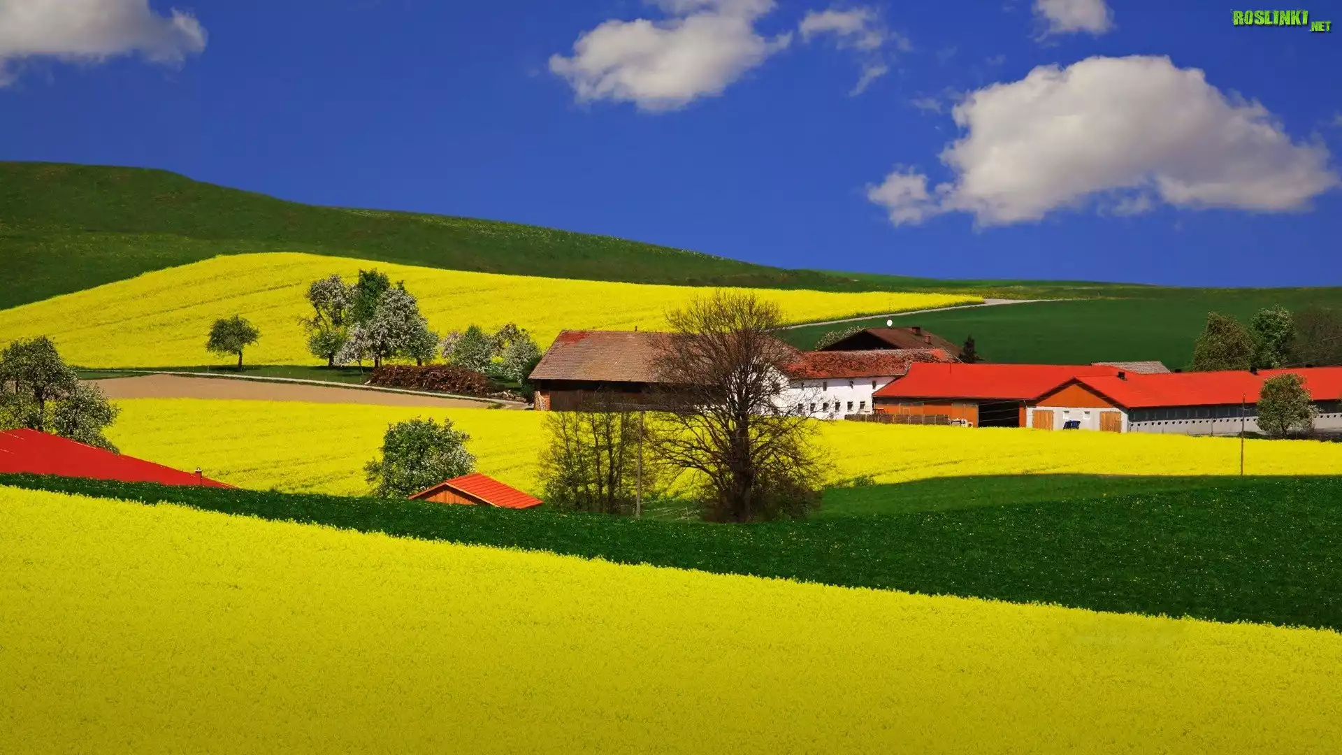 Rośliny: Pola, Budynki, Drzewa, Chmury