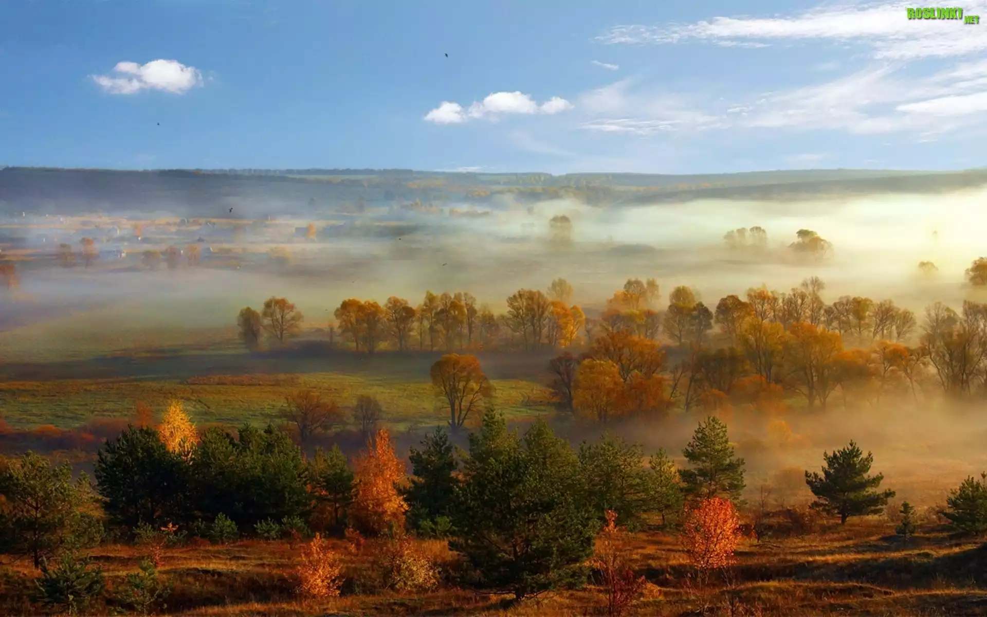 Rośliny: Pola, Drzewa, Mgła, Panorama, Jesień