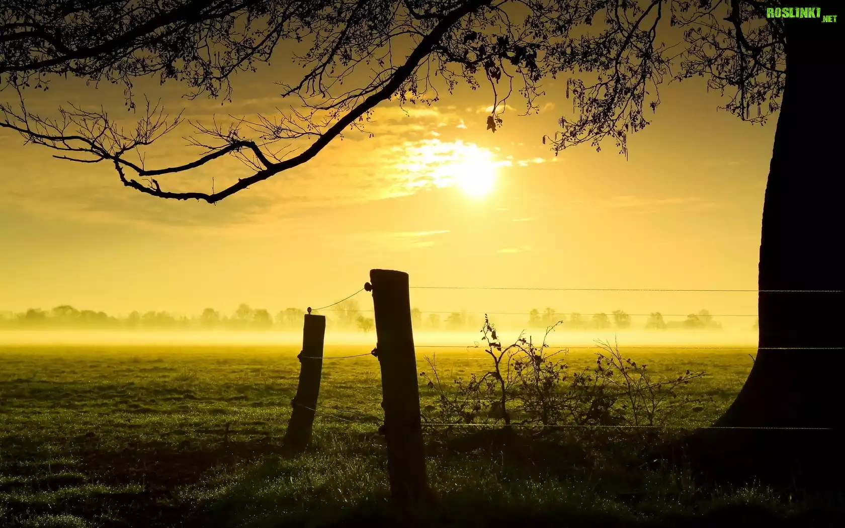 Pola, Drzewa, Mgła, Wschód, Słońca