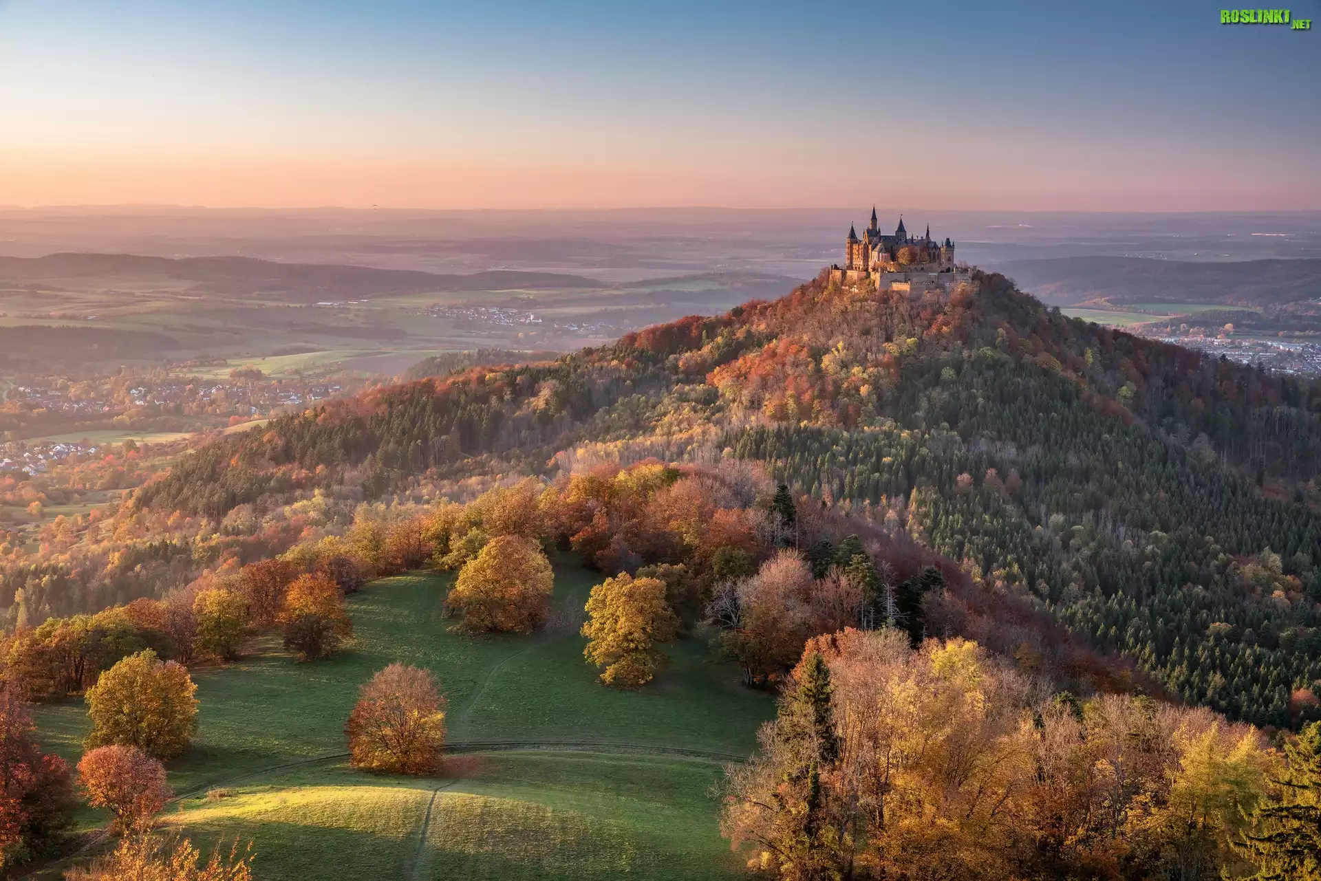 Rośliny: Niemcy, Badenia-Wirtembergia, Hechingen, Zamek Hohenzollern, Jesień, Góra, Drzewa, Pola