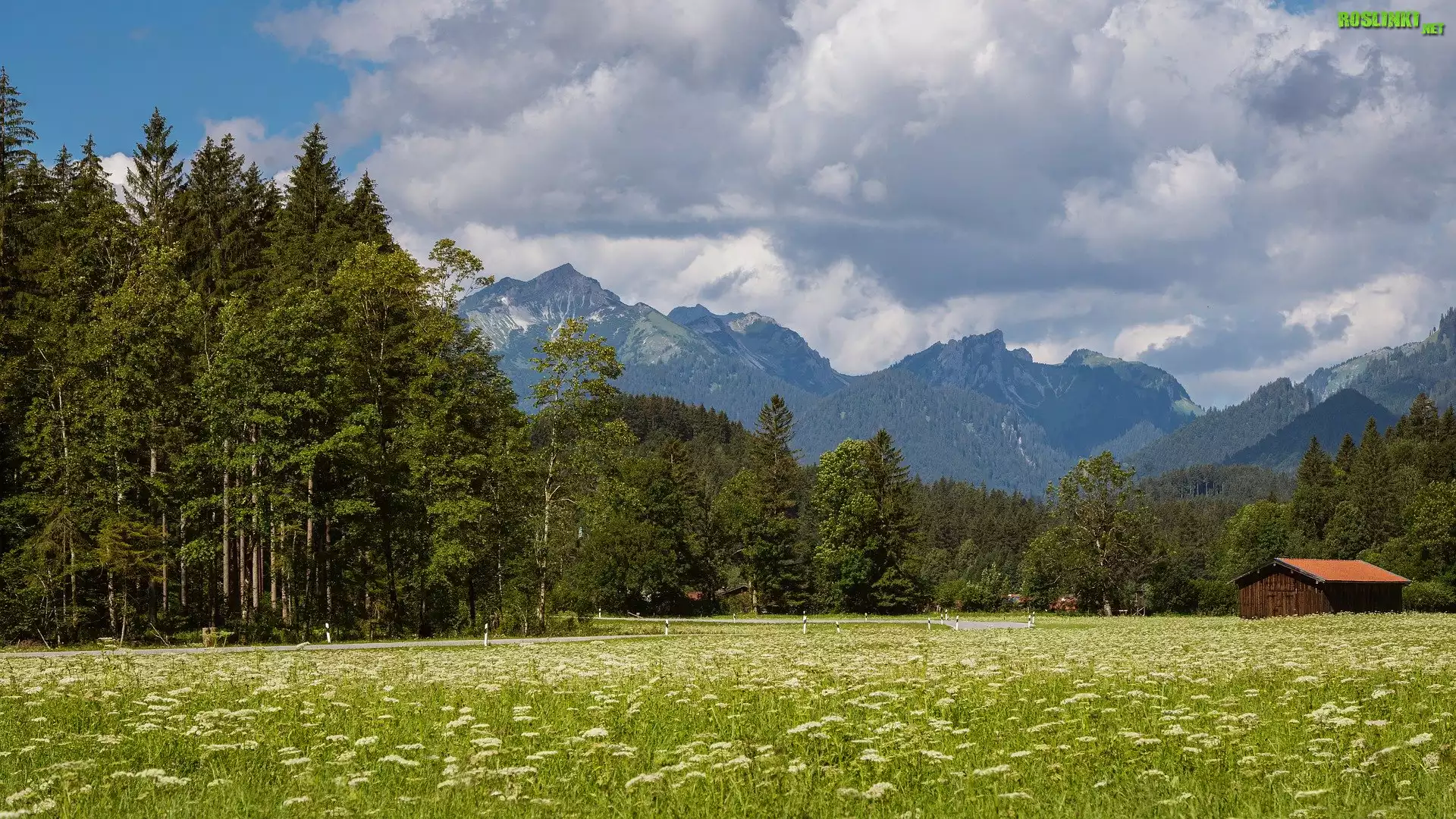 Rośliny: Góry, Polana, Łąka, Kwiaty, Dom, Szopa, Las, Drzewa