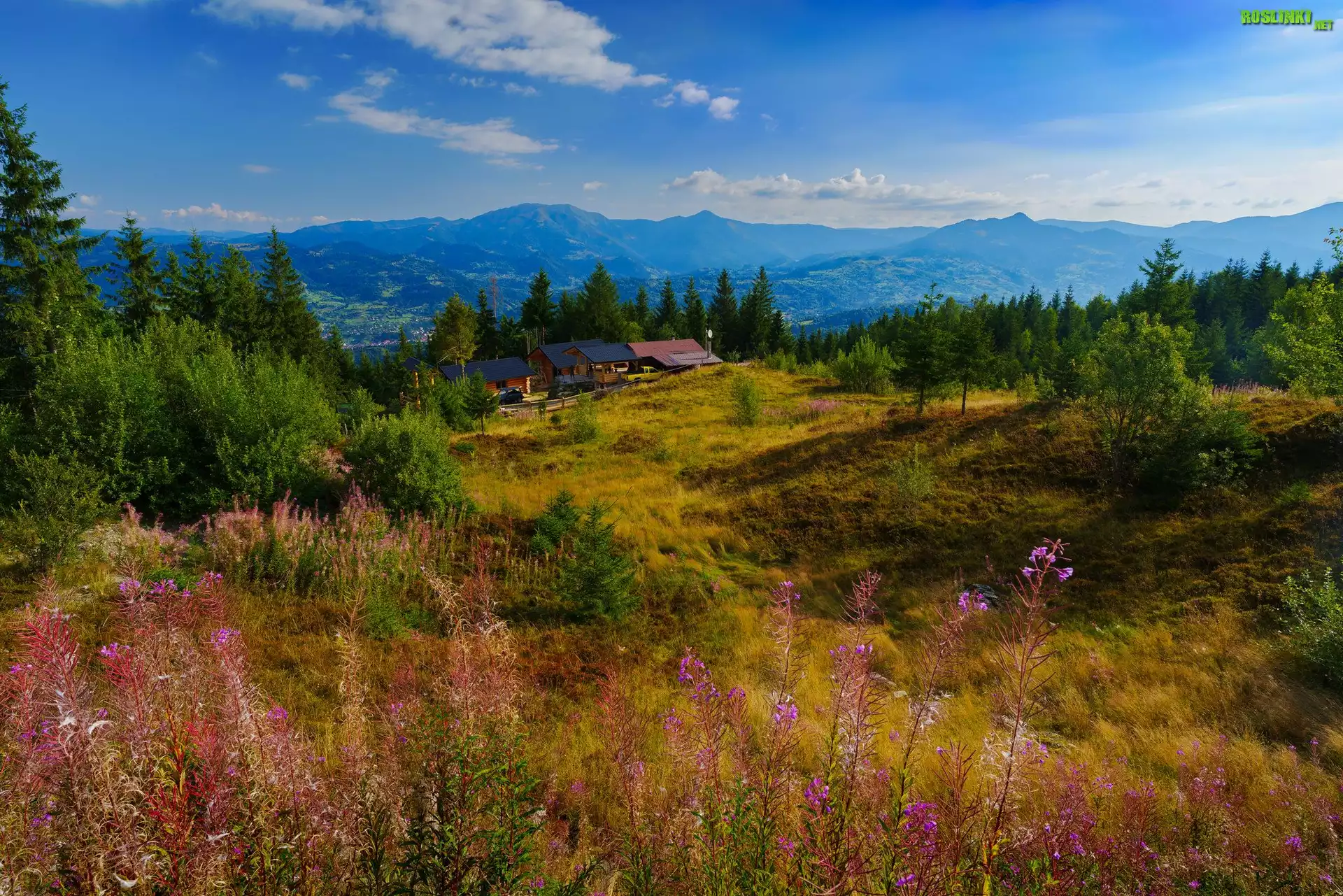 Rośliny: Rumunia, Góry, Karpaty, Polana, Drzewa, Domy, Lato