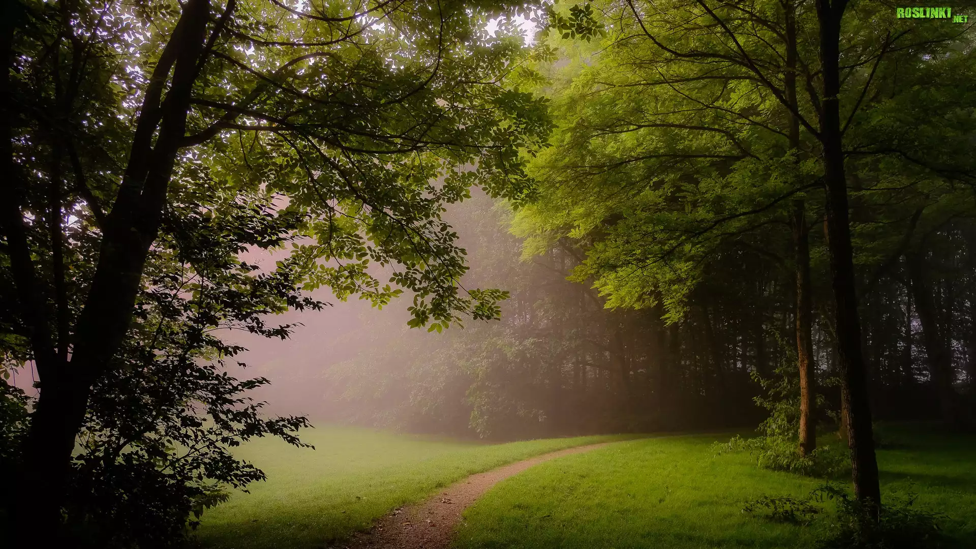 Rośliny: Las, Polana, Ścieżka, Drzewa, Mgła