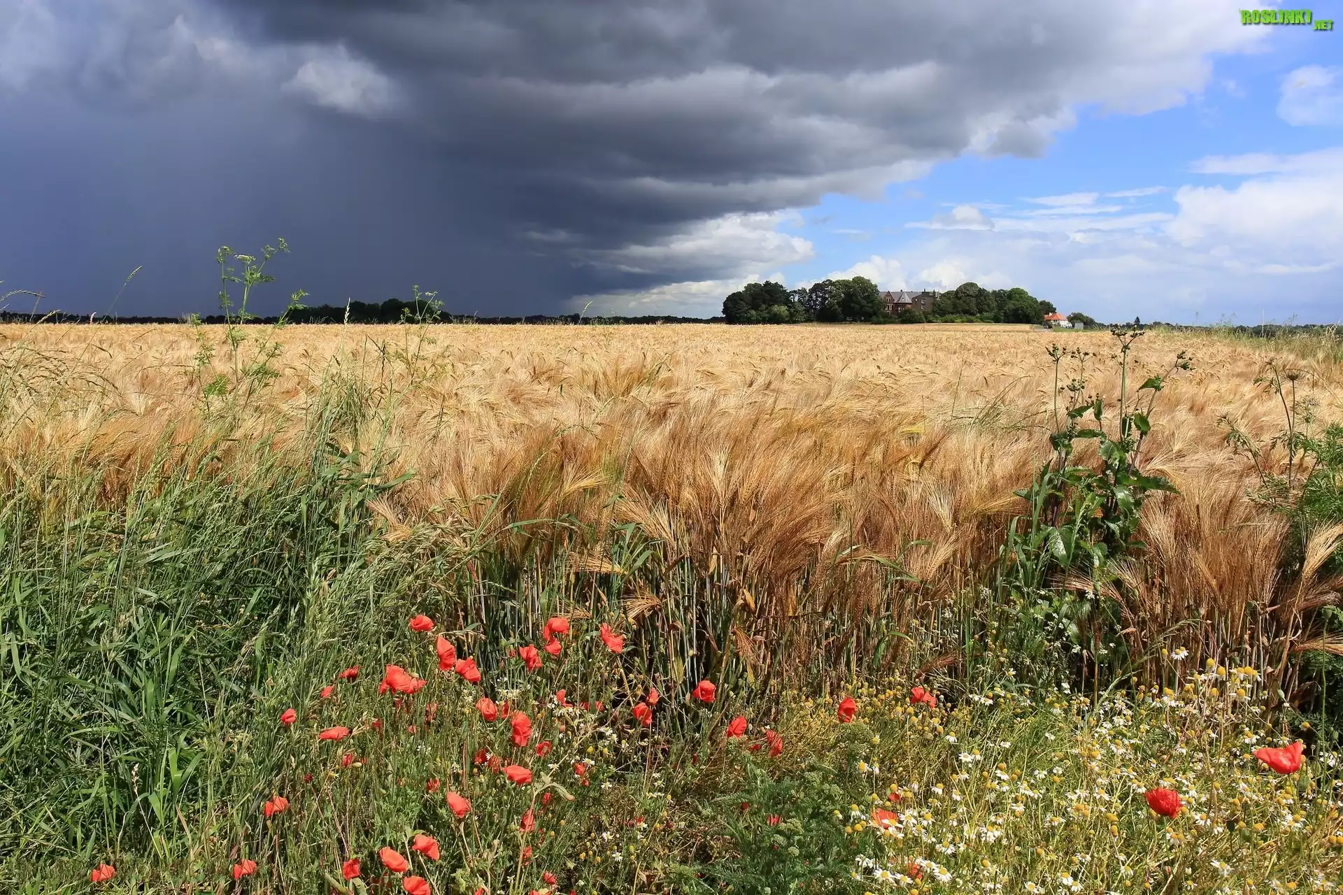 Rośliny: Pole, Maki, Zboże, Chmury, Dom