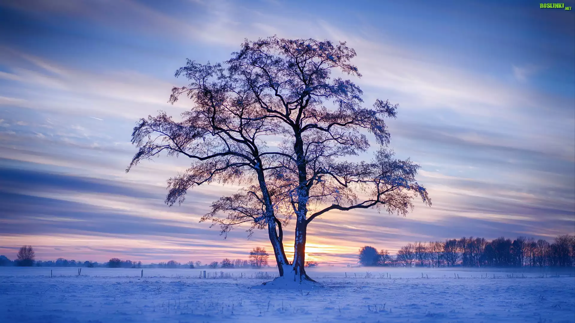 Rośliny: Drzewo, Pole, Zima, Wschód słońca, Niebo, Chmury