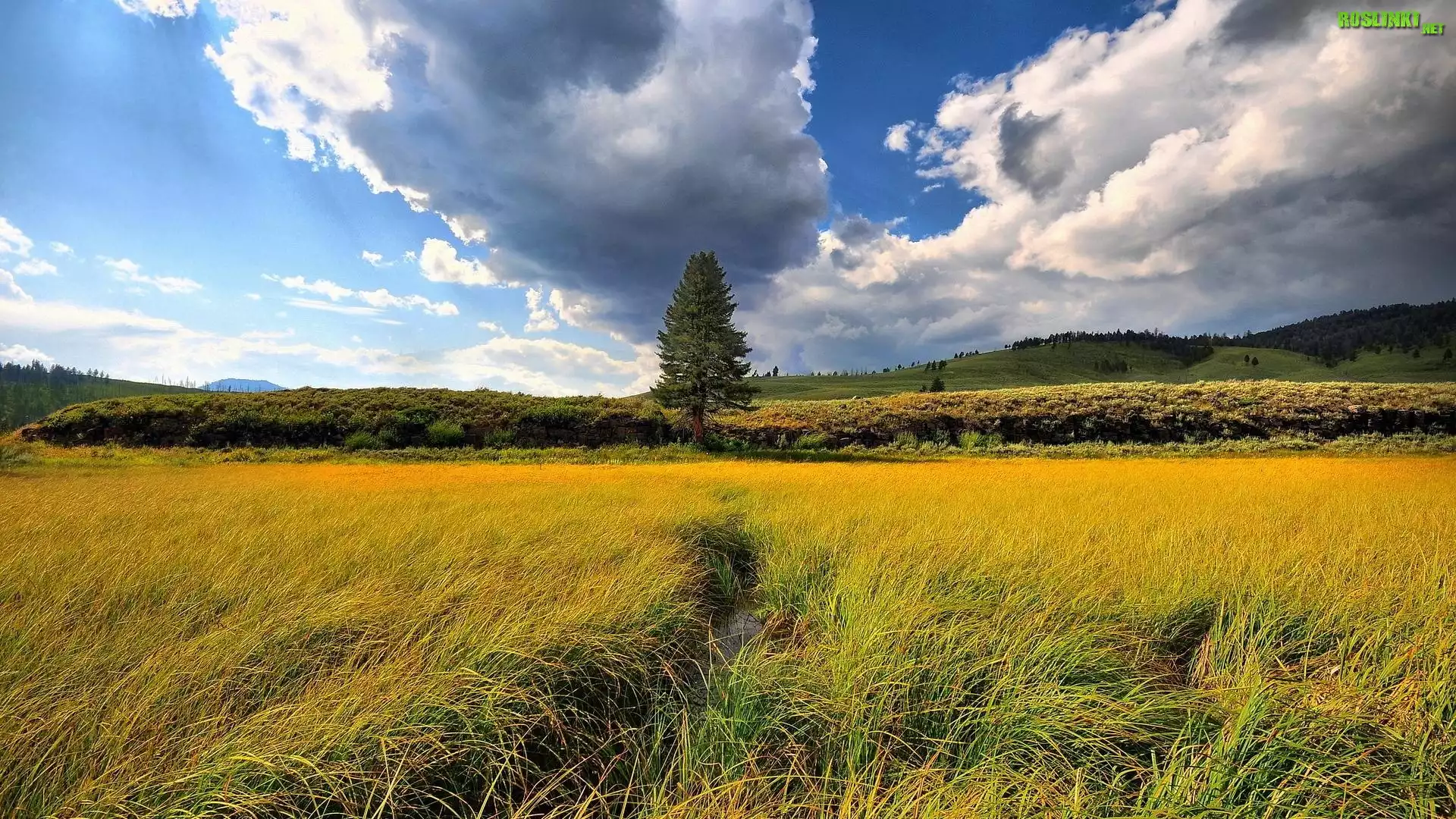 Rośliny: Pole, Wzgórza, Drzewo, Chmury