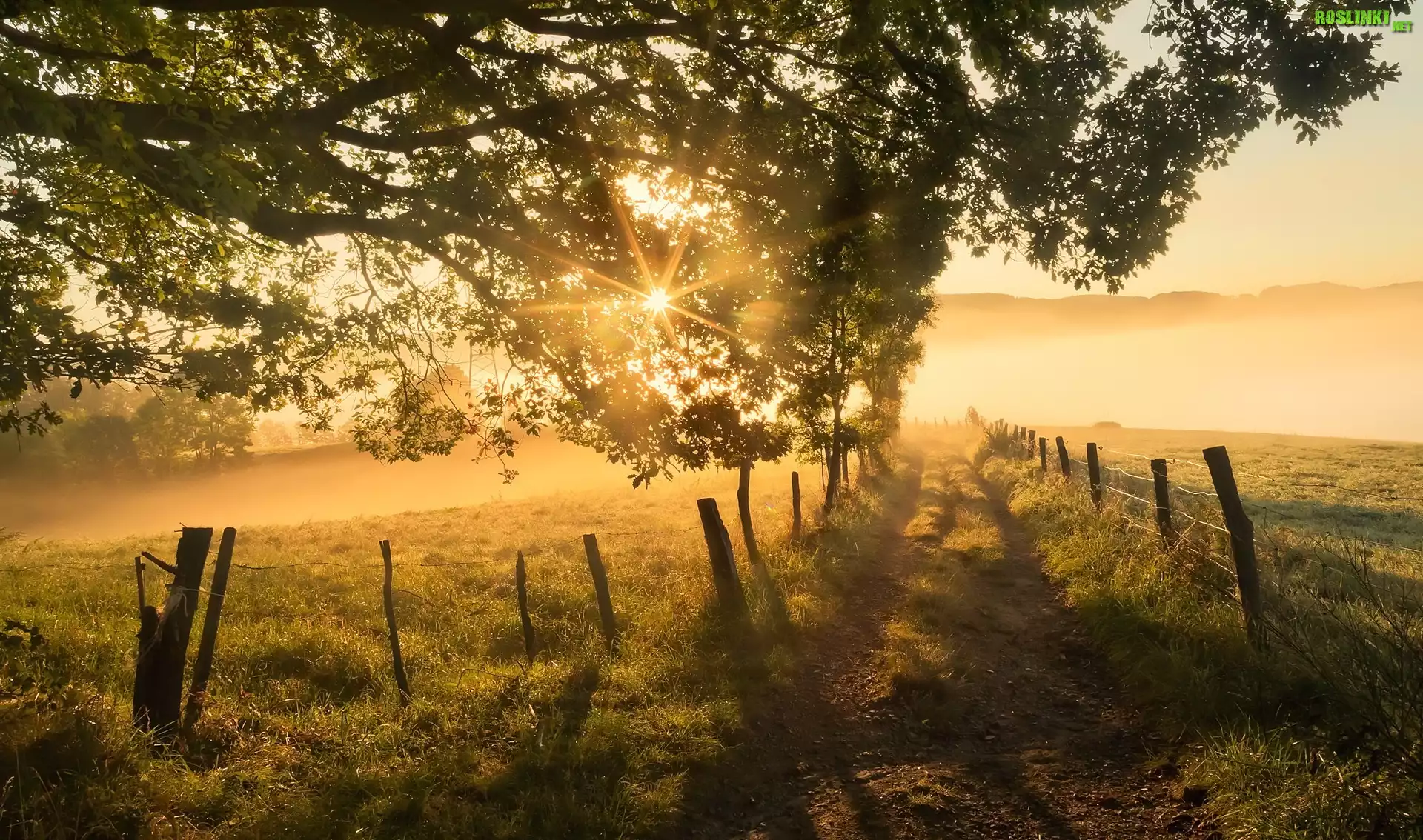 Rośliny: Pole, Droga, Ogrodzenie, Drzewo, Gałęzie, Mgła, Poranek, Przebijające światło