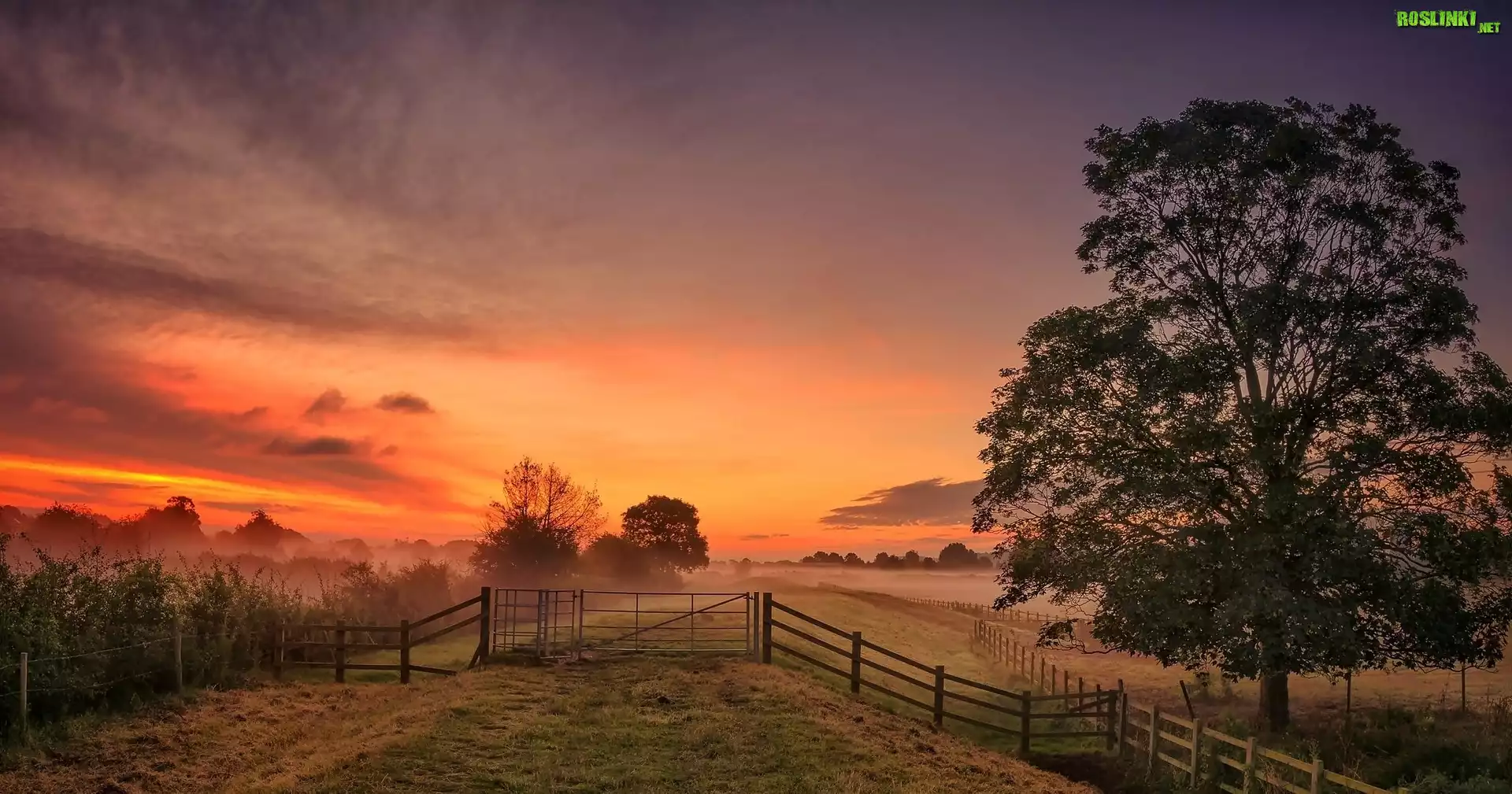 Rośliny: Pole, Drzewo, Zachód, Słońca, Ogrodzenie
