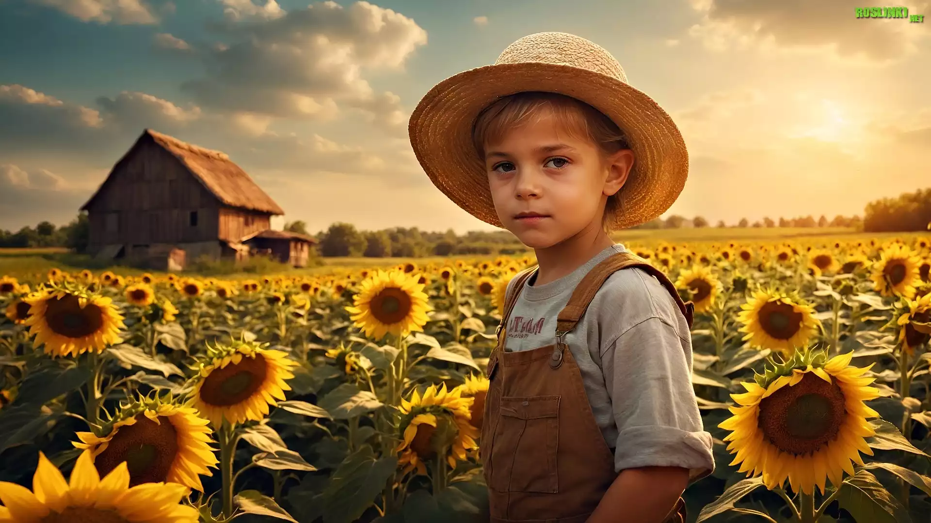 Rośliny: Dziecko, Chłopiec, Kapelusz, Pole, Słoneczniki, Szopa