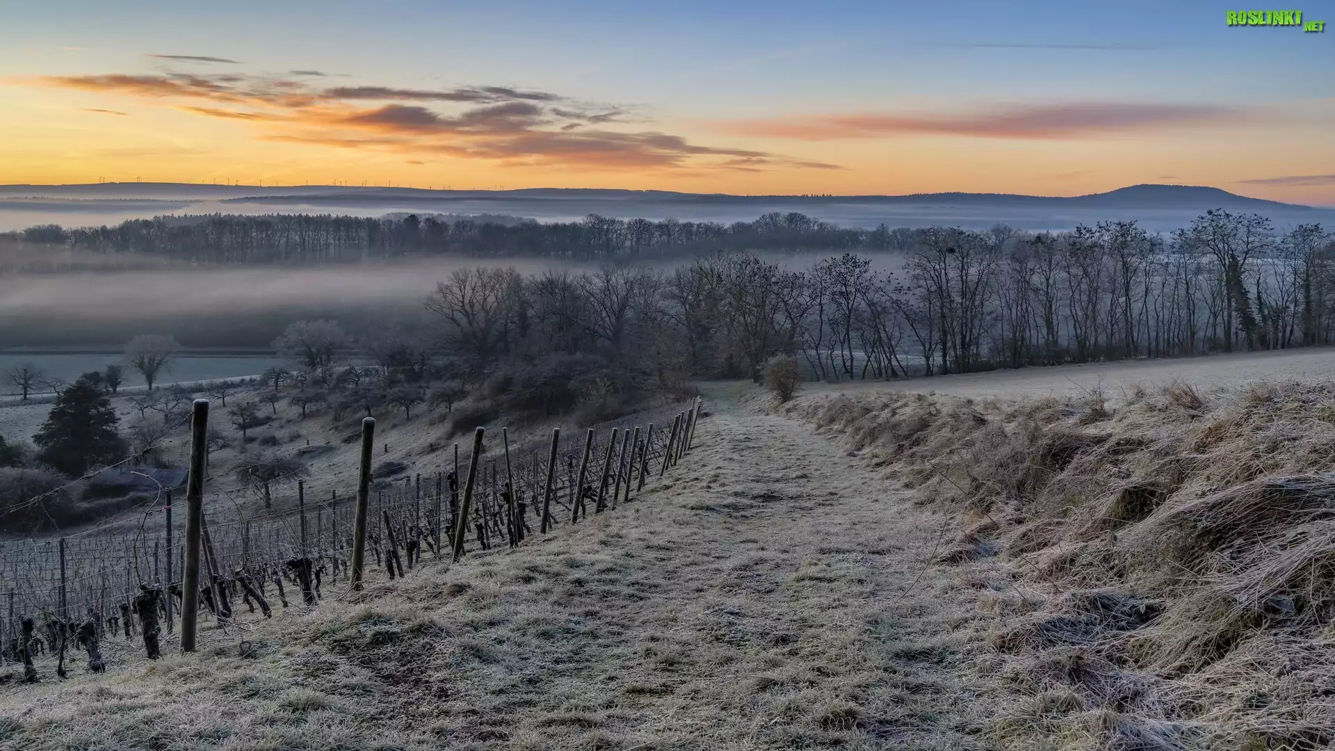 Rośliny: Wschód słońca, Winnice, Pole, Drzewa, Szron