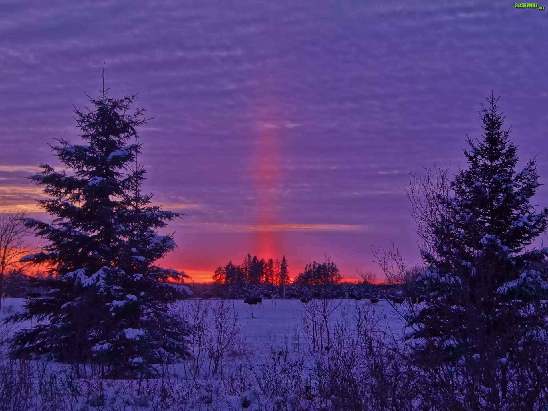 Rośliny: Pole, Zachód, Słońca, Świerki, Śnieg