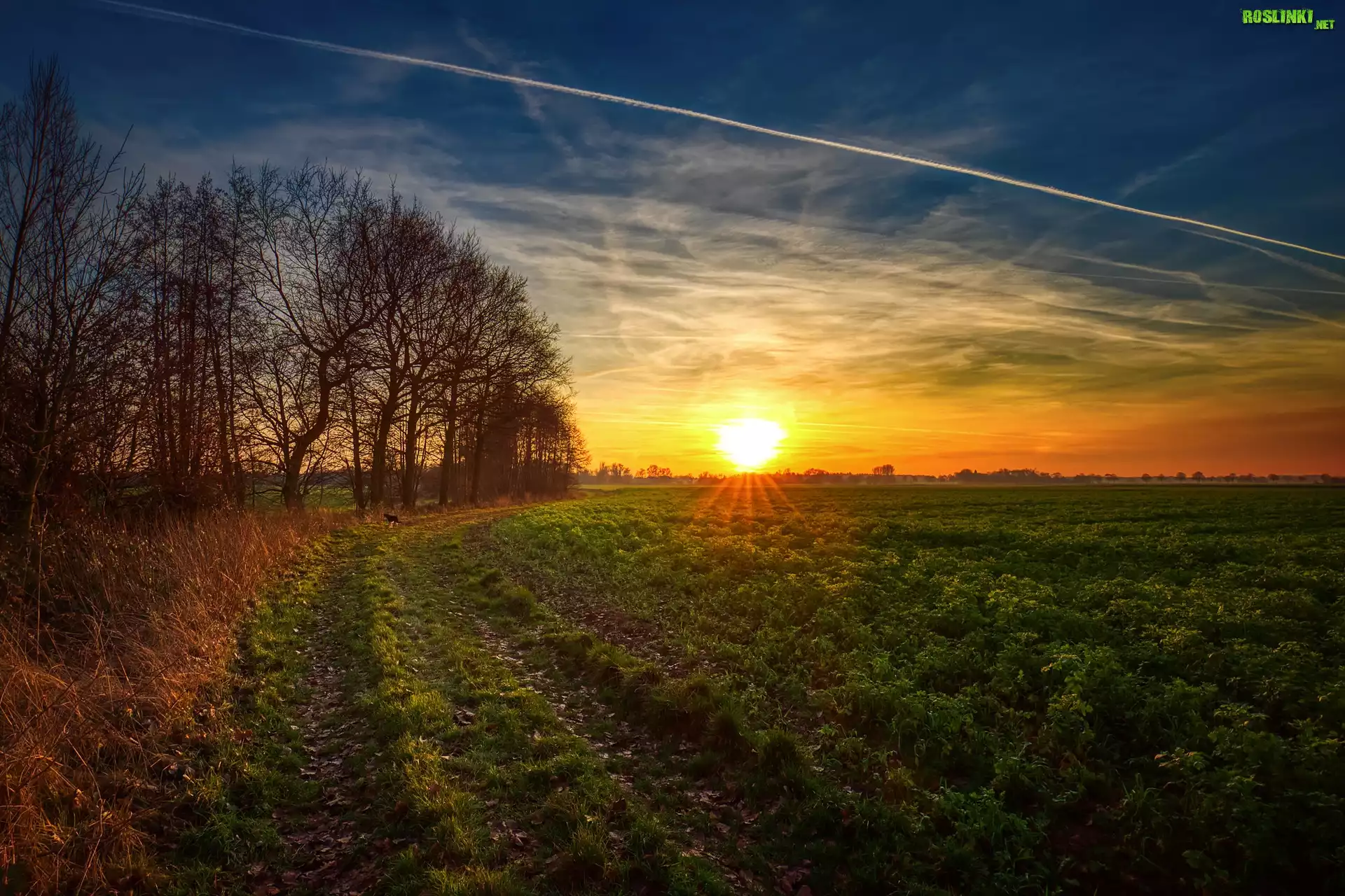 Rośliny: Pole, Drzewa, Droga, Pies, Wschód słońca