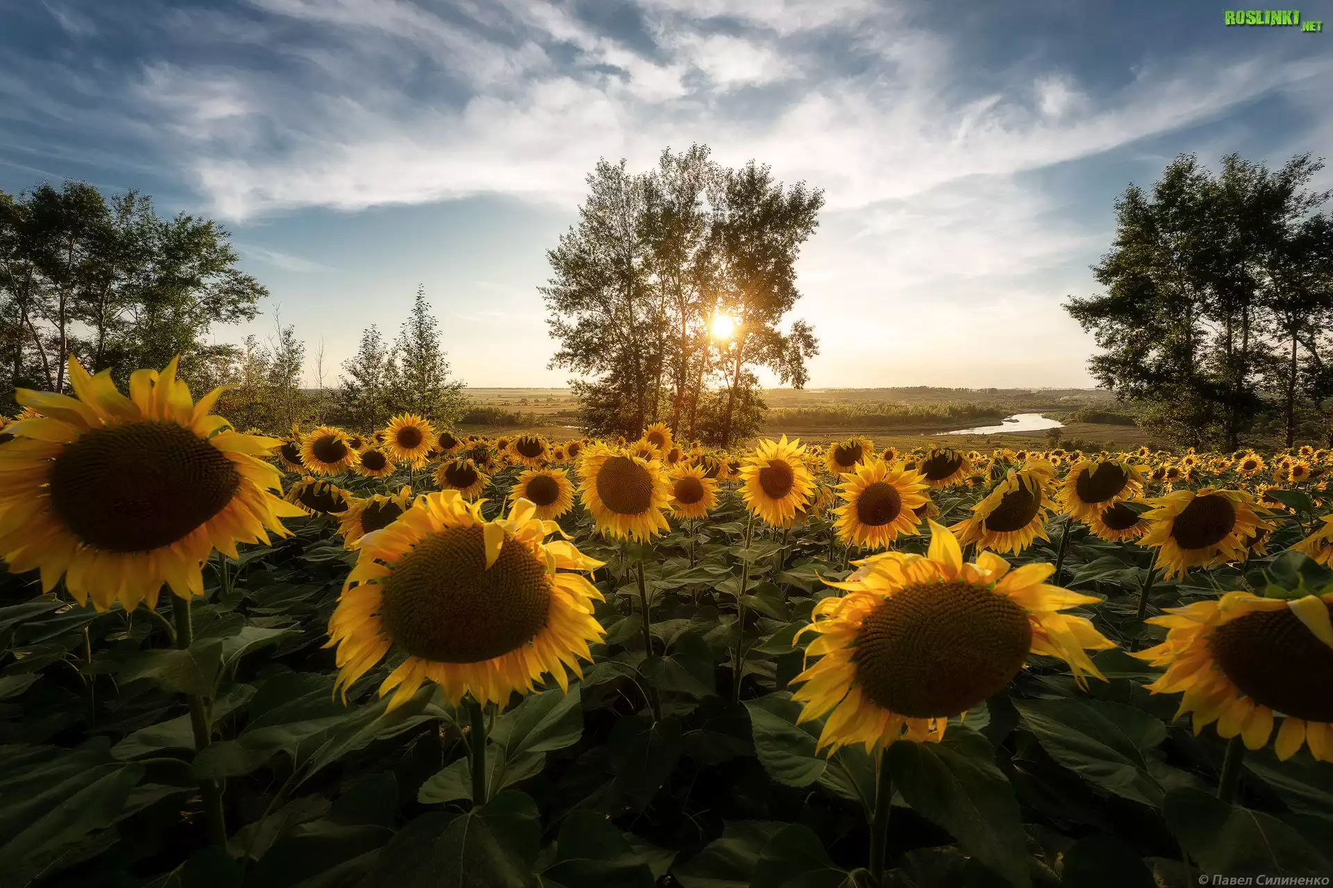 Rośliny: Pole, Słoneczniki, Drzewa, Rzeka, Wschód słońca
