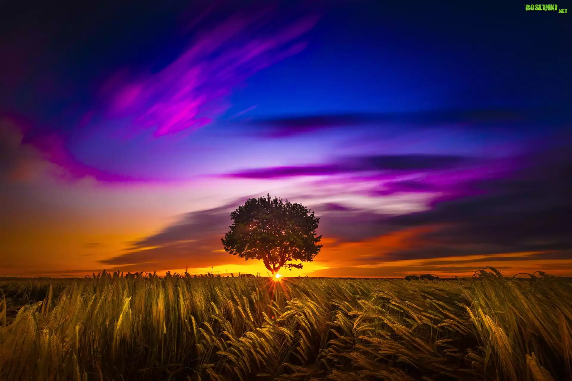 Rośliny: Pole, Drzewo, Chmury, Zachód słońca