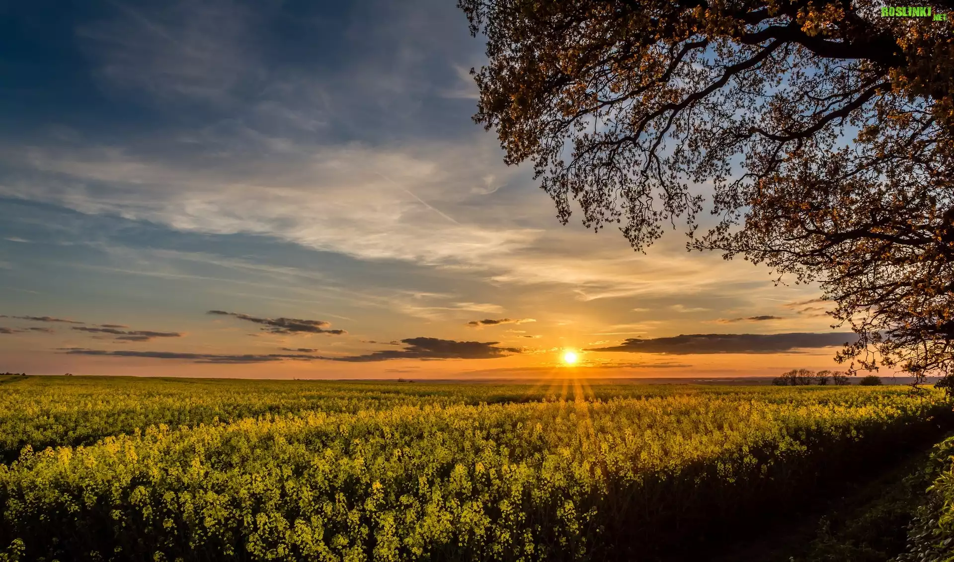 Rośliny: Pole, Rzepak, Ścieżka, Drzewo, Zachód słońca