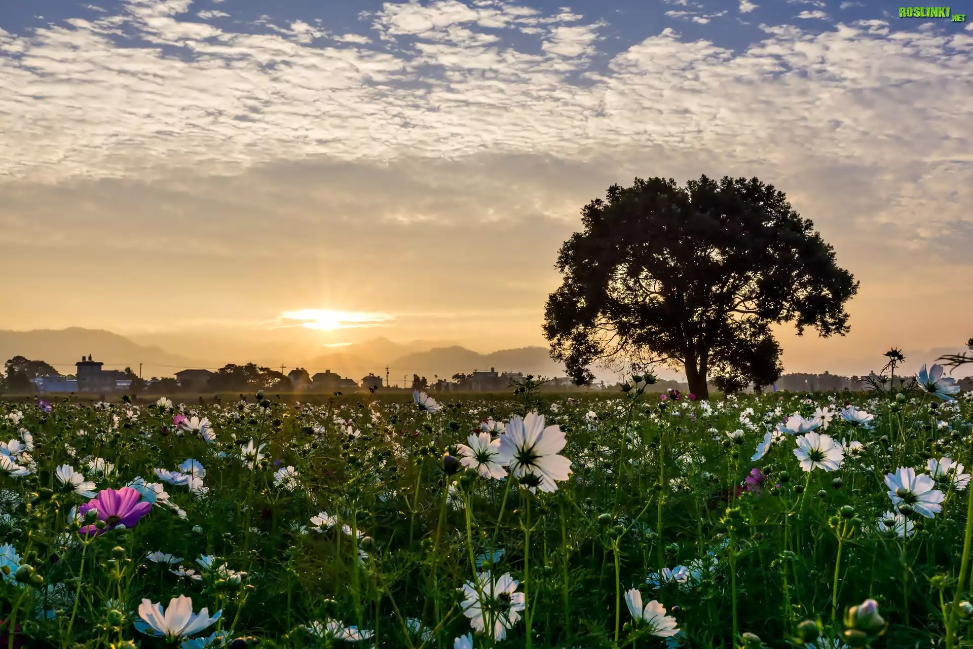 Rośliny: Pole, Kwiaty, Drzewo, Zachód Słońca