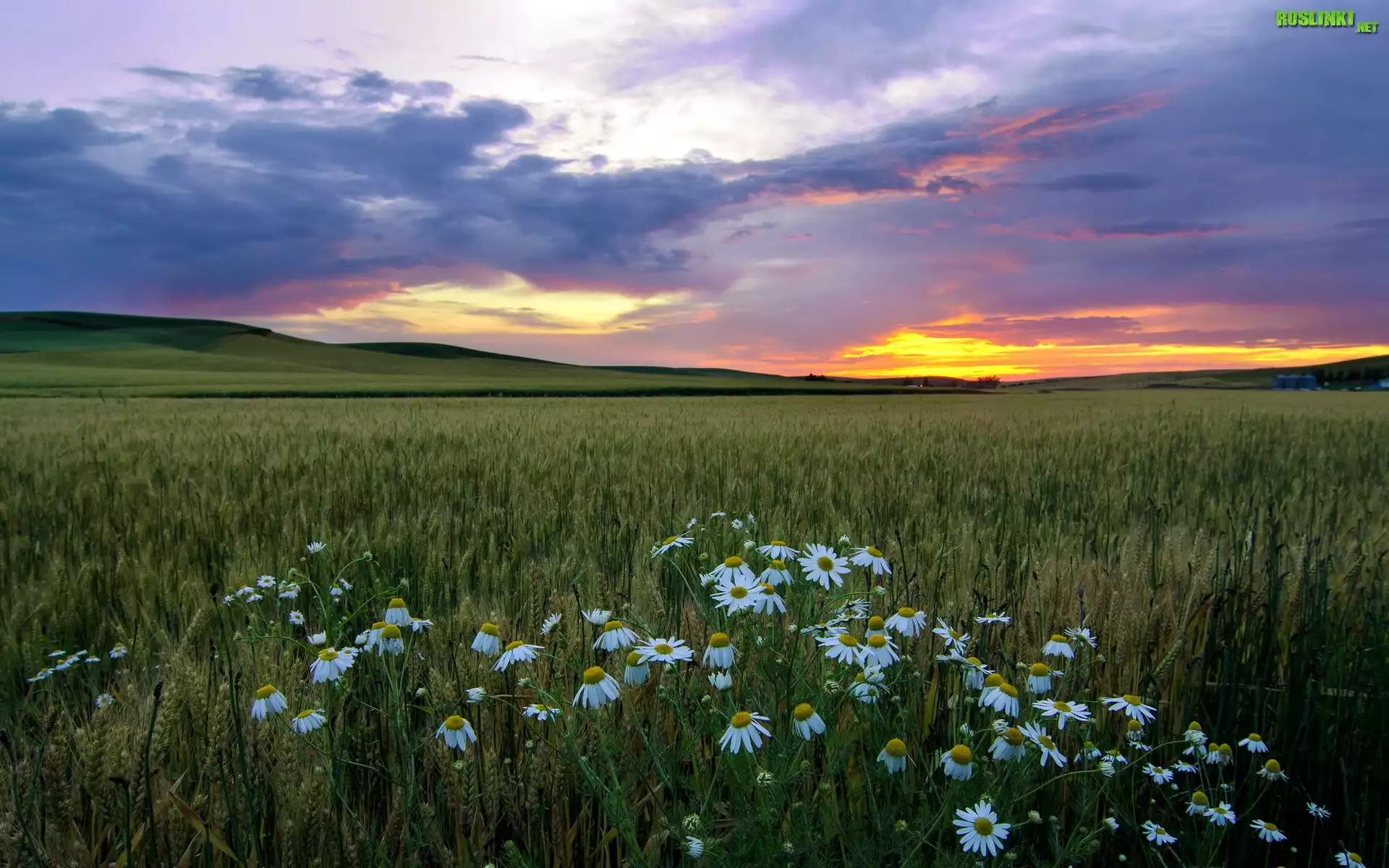 Rośliny: Pole, Zboże, Rumianki, Góry, Zachód, Słońca