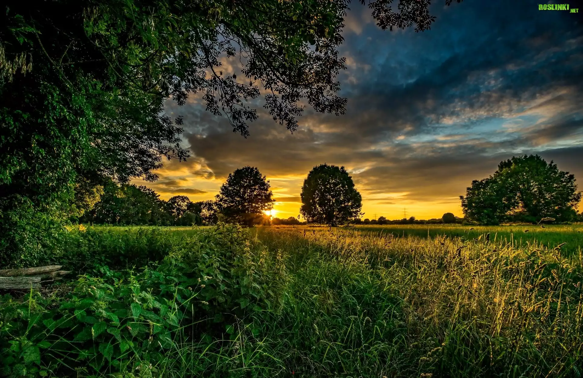 Rośliny: Pole, Drzewa, Trawa, Zachód, Słońca