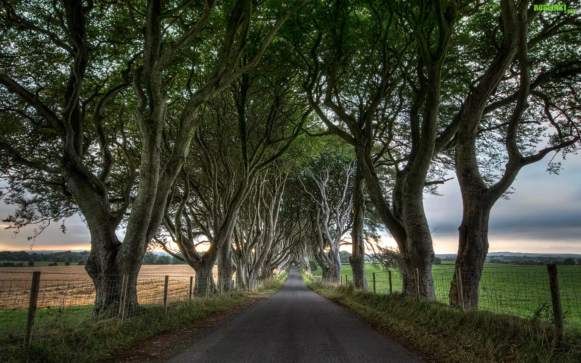 Rośliny: Droga, Pola, Ogrodzenie, Drzewa, Buki, Aleja, Dark Hedges, Irlandia Północna