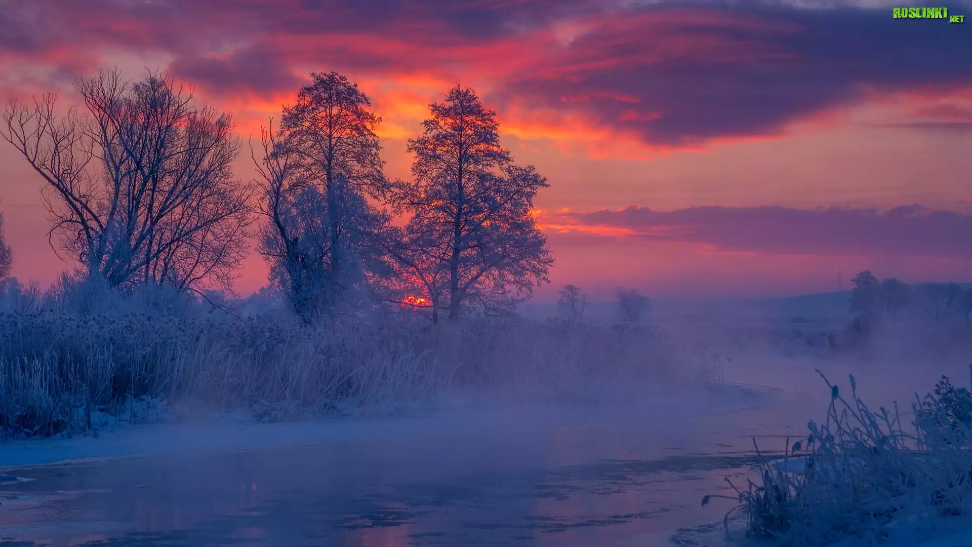 Rośliny: Zima, Rzeka Gwda, Mgła, Śnieg, Drzewa, Zachód słońca, Polska