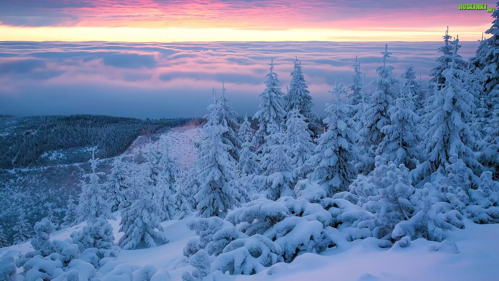 Rośliny: Zima, Śnieg, Wschód słońca, Drzewa, Świerki, Góry, Karkonosze, Polska