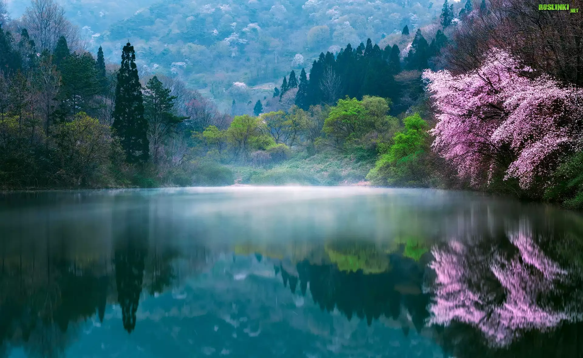 Rośliny: Korea Południowa, Wiosna, Jezioro, Poranek, Mgła, Drzewa
