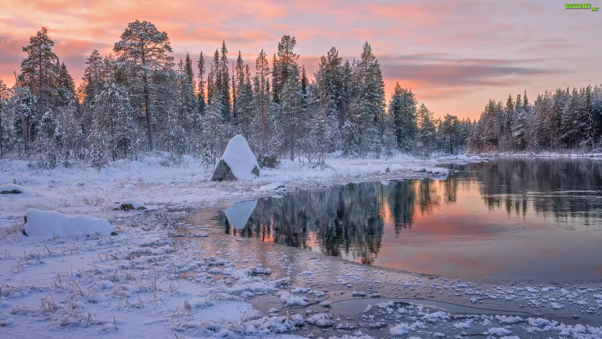 Rośliny: Zima, Las, Ośnieżone, Drzewa, Rzeka, Kolvitsa, Półwysep Kolski, Obwód murmański, Rosja