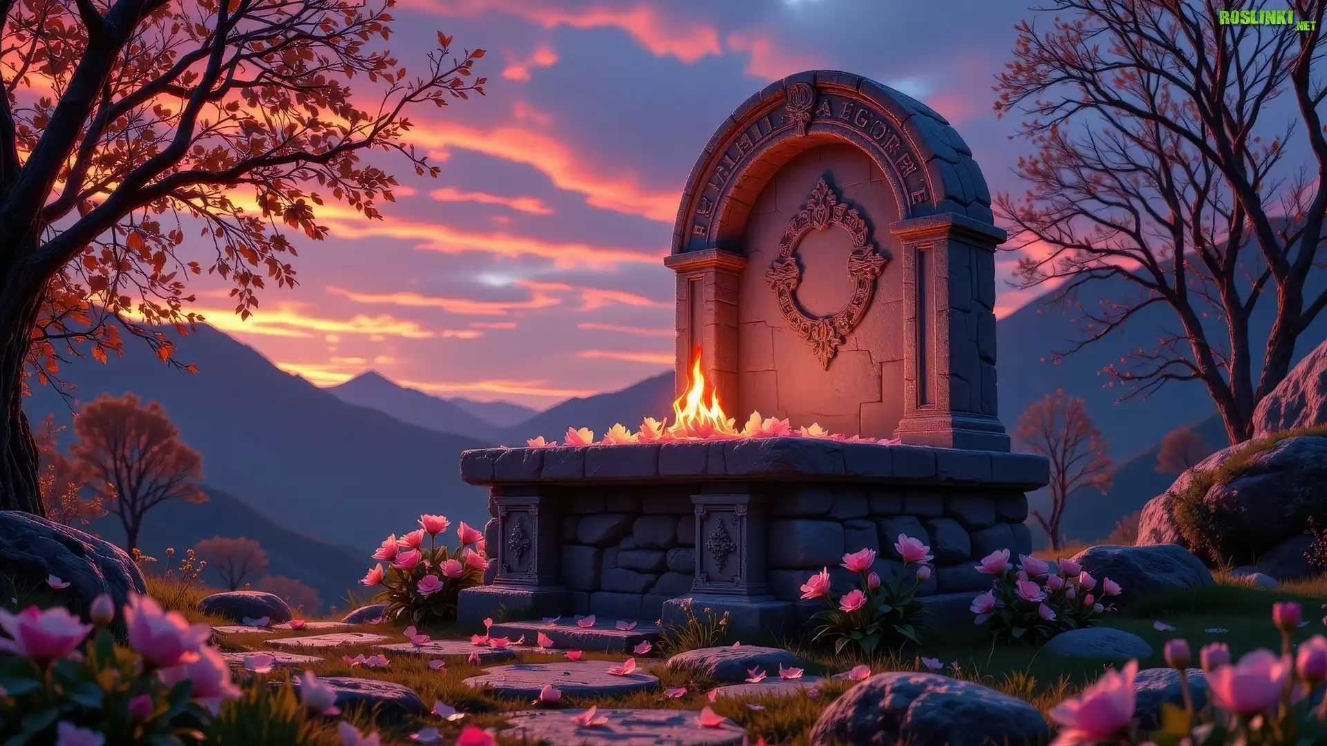 Pomnik, Tablica, Upamiętniająca, Ogień, Różowe, Kwiaty, Kamienie, Drzewa, Góry