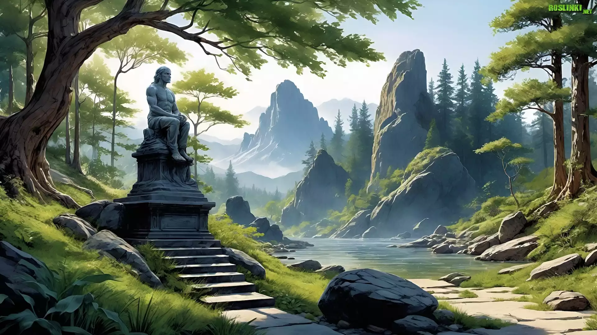 Rośliny: Grafika, Góry, Skały, Pomnik, Schody, Drzewa, Rzeka