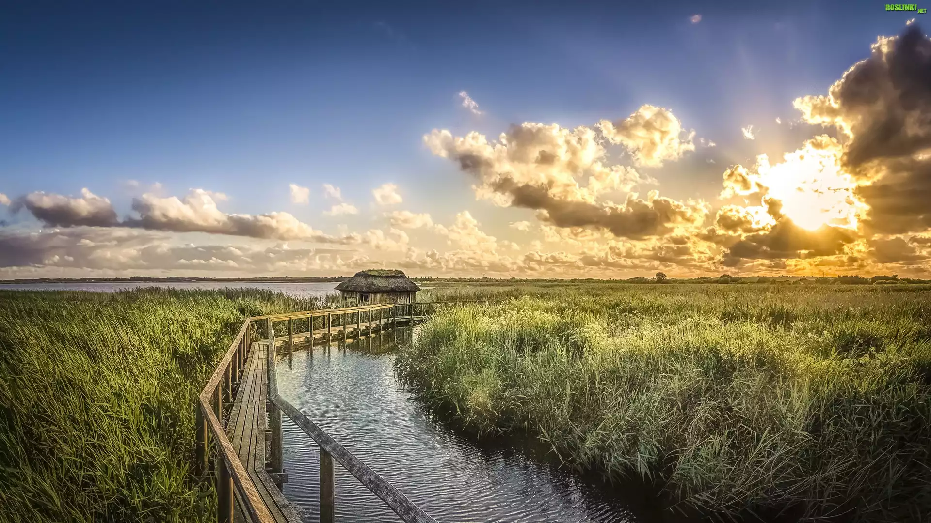 Rośliny: Pomost, Trawa, Jezioro, Chmury, Domek