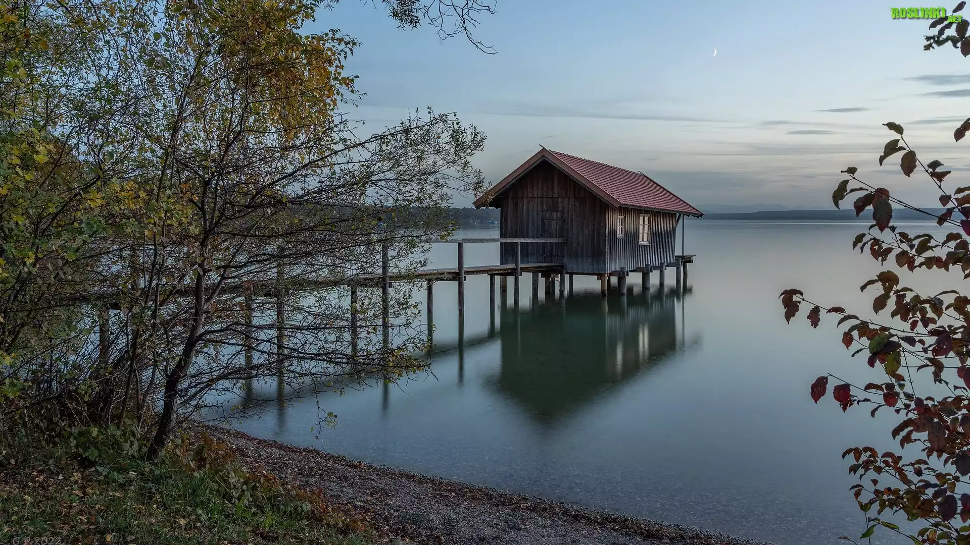 Jezioro, Pomost, Dom, Drzewa, Księżyc