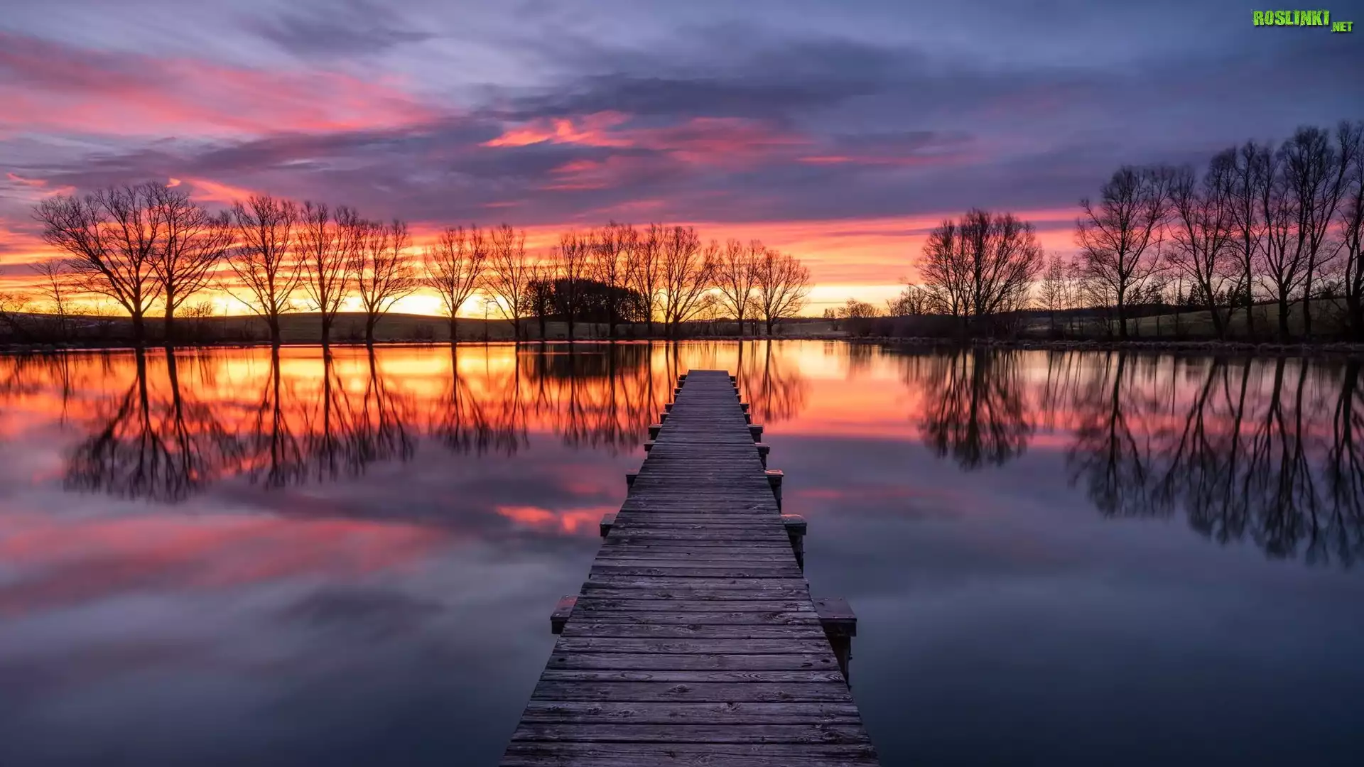 Rośliny: Jezioro, Pomost, Drzewa, Zachód słońca, Chmury, Odbicie