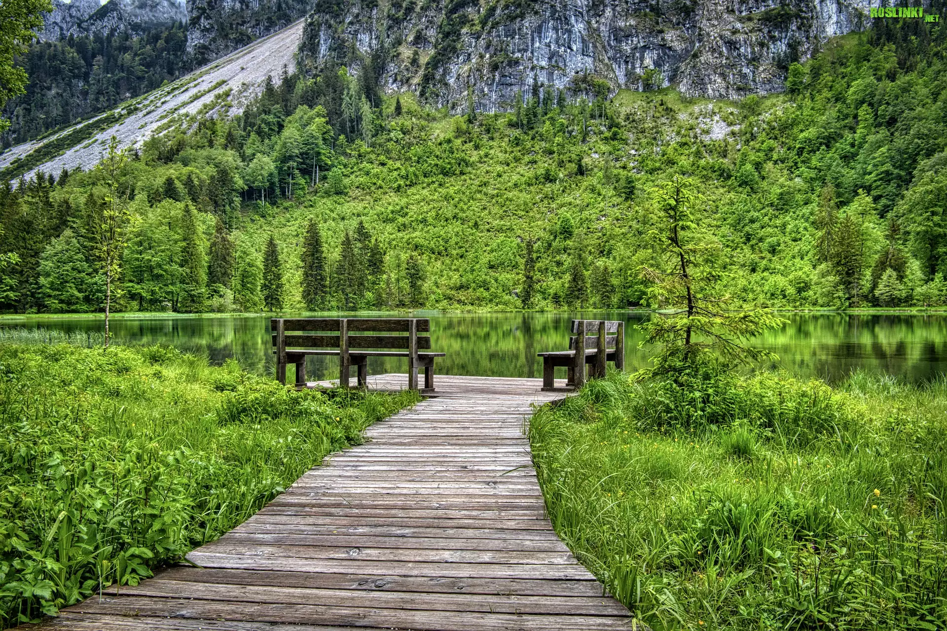 Pomost, Ławki, Rzeka, Skały, Lasy, Drzewa
