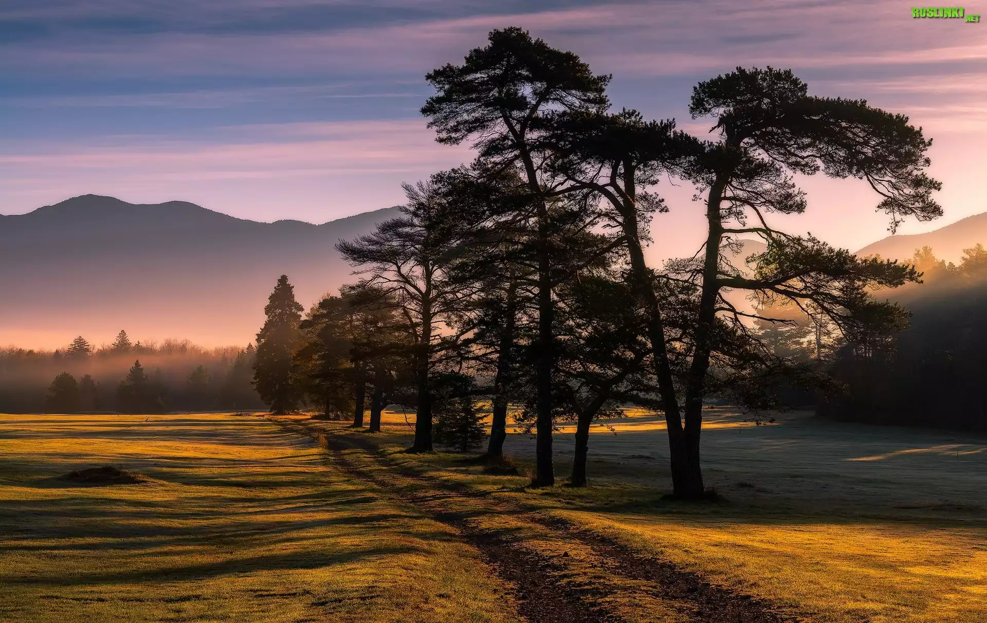 Poranek, Wschód słońca, Droga, Łąki, Drzewa