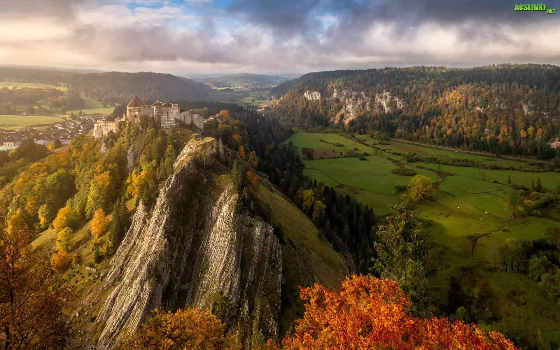 Rośliny: Jesień, Las, Drzewa, Góry, Skały, Mgła, Zamek Zhu, Chmury, Poranek, Burgundia, Francja