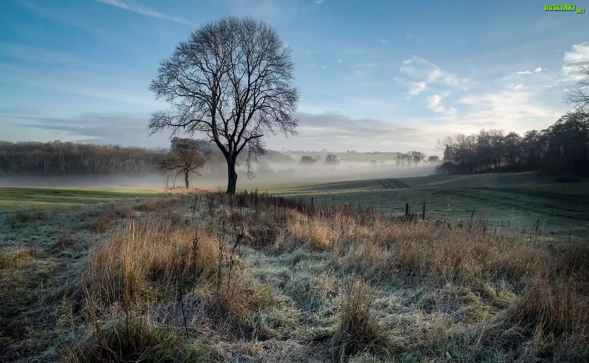 Poranek, Drzewo, Łąki, Mgła, Oszroniona, Trawa