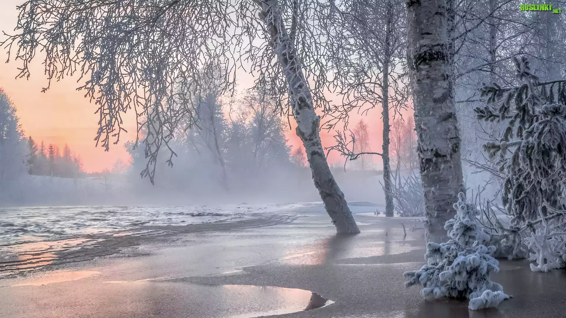 Rośliny: Zima, Mróz, Oszronione, Drzewa, Jezioro, Lód, Mgła, Poranek