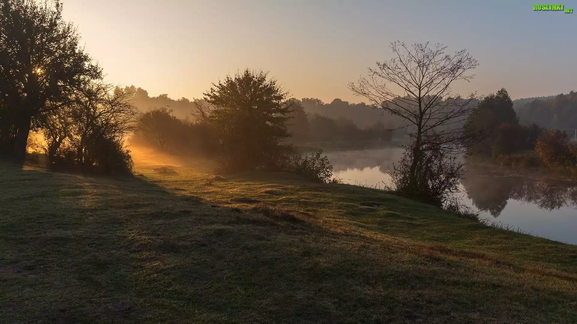 Rośliny: Poranek, Mgła, Blask, Słońca, Rzeka, Drzewa