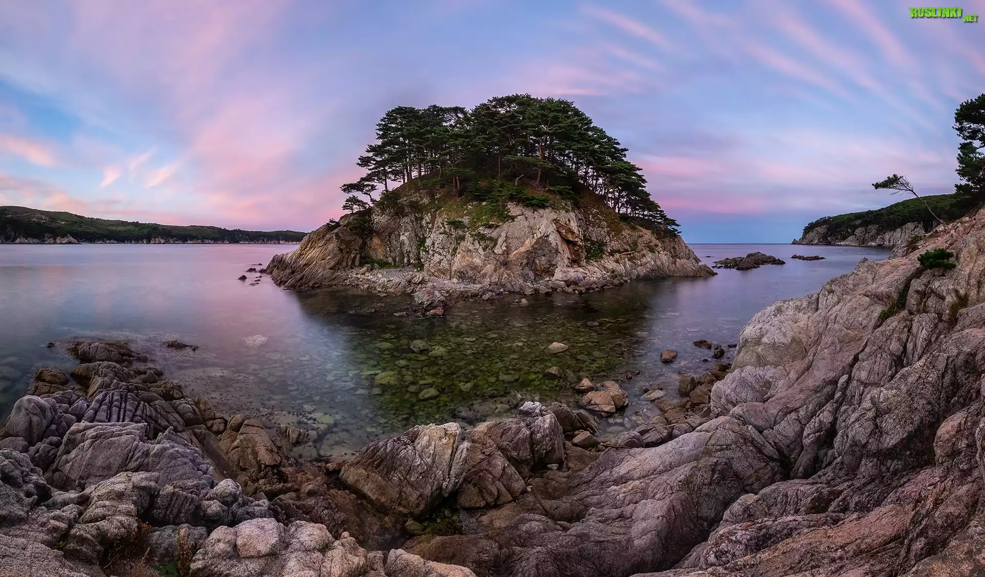 Rośliny: Poranek, Morze, Wysepka, Skały, Drzewa