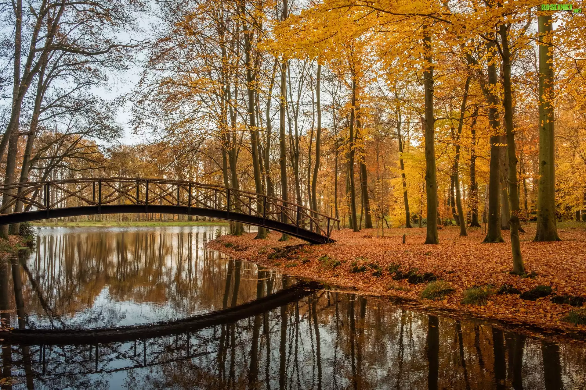 Rośliny: Holandia, Prowincja Geldria, Gmina Brummen, Posiadłość Huis Voorstonden, Park, Staw, Jesień, Mostek
